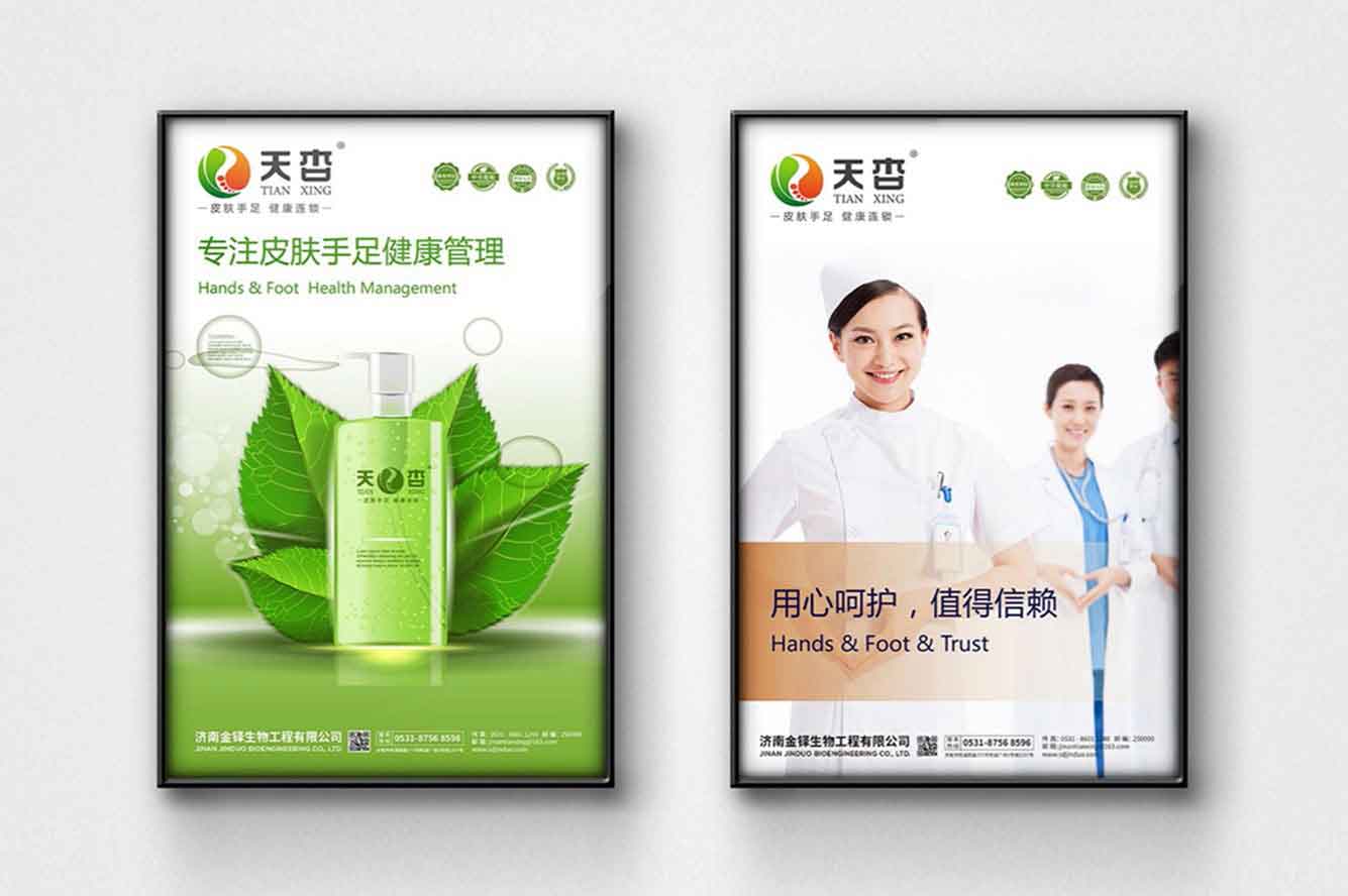 虎將設(shè)計(jì)——濟(jì)南金鐸生物工程有限公司成立于2006年,公司位于泉城濟(jì)南。是一家專業(yè)從事人類皮膚、手足健康產(chǎn)品的研發(fā)、生 產(chǎn)、銷售、服務(wù)于一體的現(xiàn)代化高新技術(shù)企業(yè),公司擁有廠房建筑面積5000多平方米。公司旗下天杏品牌于2011年成立并推出天杏品牌健康連鎖項(xiàng)目,先后在江蘇、山東、山西、河北、江西、四川、重慶、河南、安徽、遼寧、吉林等全國十幾個省、市、區(qū)建立1000多家天杏健康連鎖品牌店。為數(shù)以萬計(jì)的皮膚亞健康患者帶來了健康與福音,并為社會培養(yǎng)超過2000多位創(chuàng)業(yè)精英。